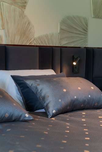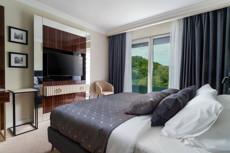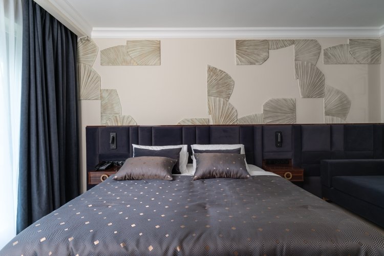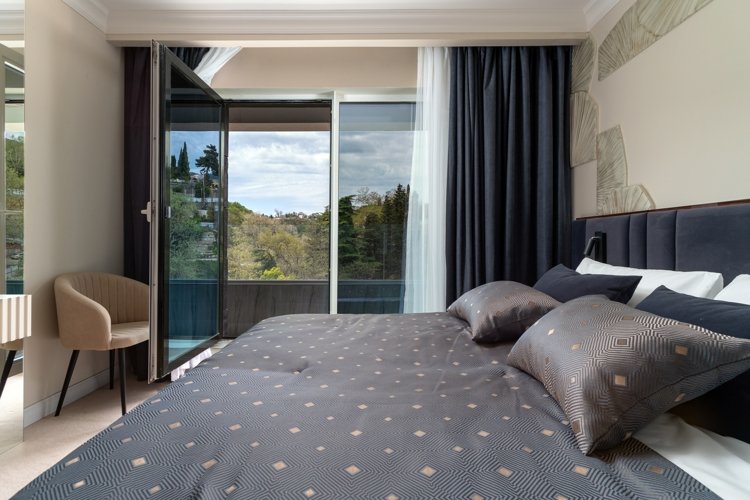 В проекте представлены номера площадью от 25 до 49 кв. метров. Сдаются они с мебелью в 5 цветовых решениях, панорамными окнами и высотой потолков 3 метра. Все номера имеют вид на море или горы.