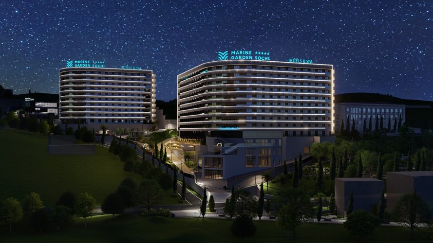 Гостиничный комплекс 5 звезд представляет собой 2 здания высотой в 10 этажей, возведенных по монолитной технологии строительства на территории 2,8 ГА. Фасады облицованы известняковыми плитами белого цвета и черным сланцем природного происхождения.