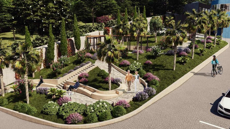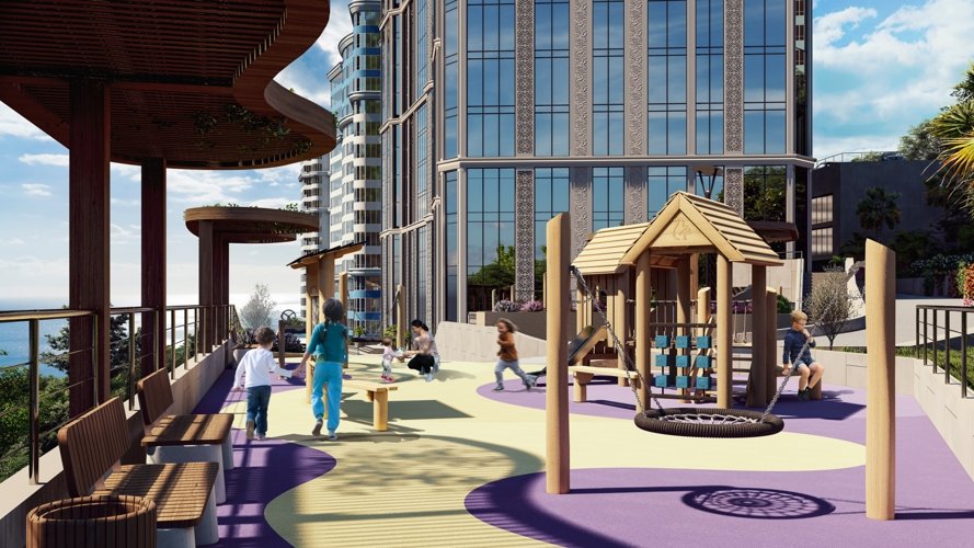 Концепция комплекса черпает вдохновение в самой природе побережья. Плавные, волнообразные линии фасадов и обилие панорамного остекления создают ощущение движения и света, органично вписывая здания в зеленый ландшафт сочинского холма.